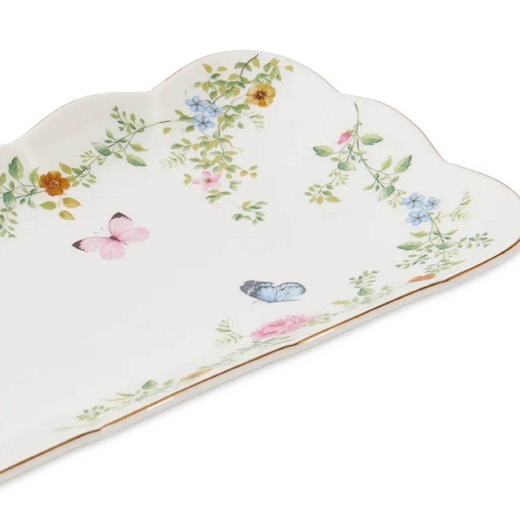 Enhance your dining experience with the Serving Platter. Crafted from high-quality porcelain, this platter features a delicate design of butterflies gracefully fluttering in soft pastel hues, bringing a touch of elegance and charm to your table. Perfect for serving appetizers, snacks, or main courses, the smooth, durable surface ensures both beauty and functionality. Whether for casual meals or special occasions, this platter serves as a stunning centerpiece. It makes for a thoughtful and elegant gift. Measures 36 x 15 cm.Â