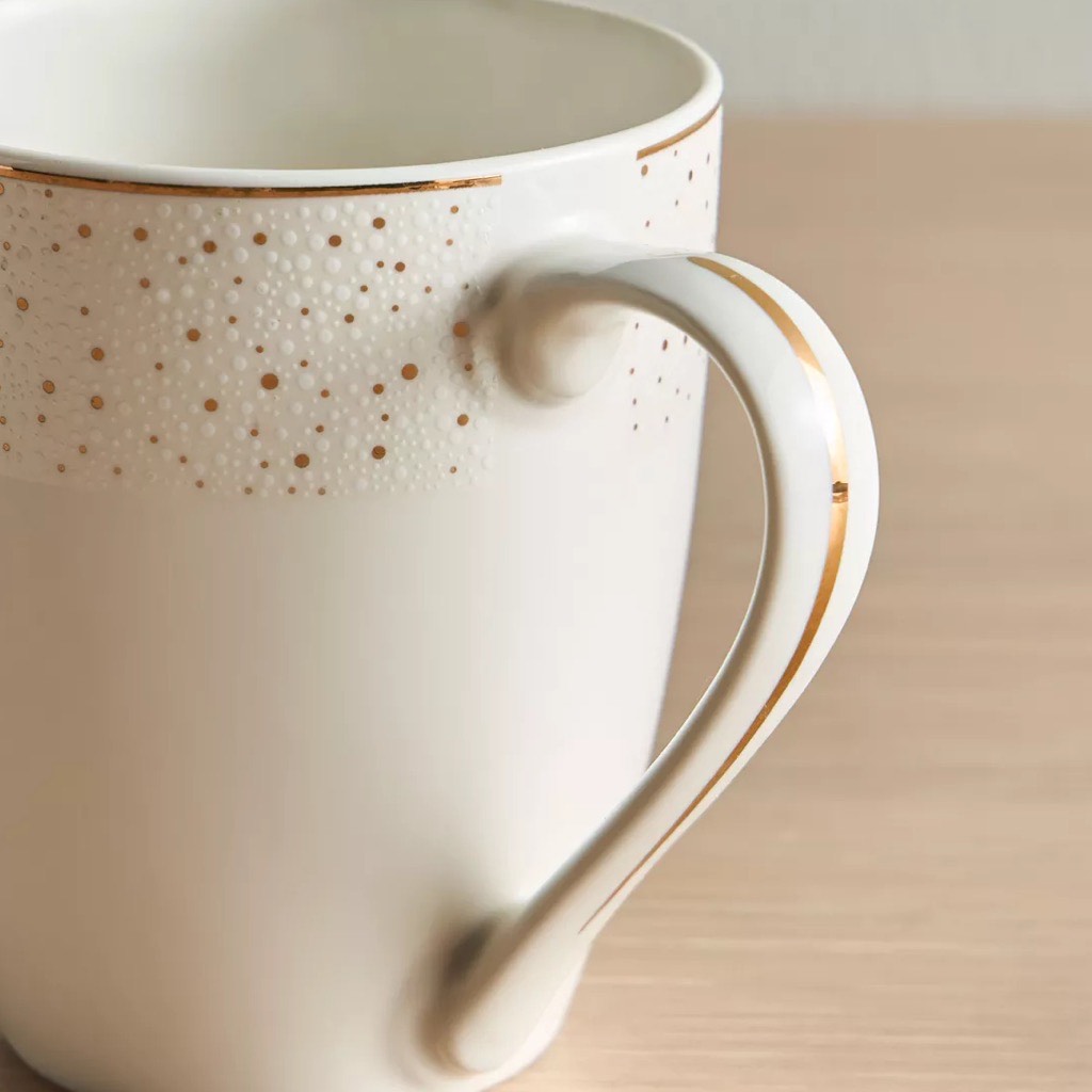 Enhanced by a subtle surface design on the exterior, this light-toned mug is apt for serving hot beverages such as coffee or hot chocolate. It is well-crafted from porcelain and is food-safe. Furthermore, this mug comes with a curved handle and is suitable for cleaning in a dishwasher. 360 ml.