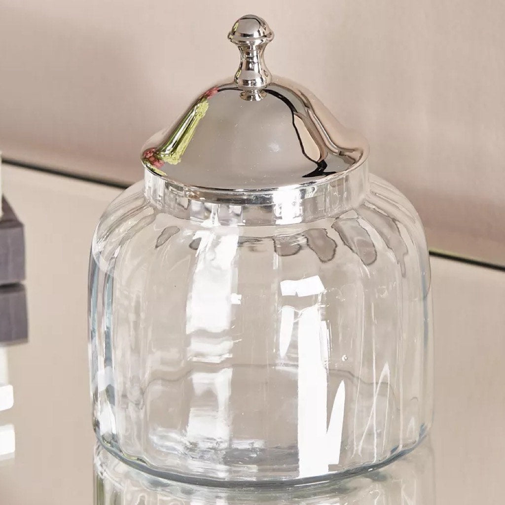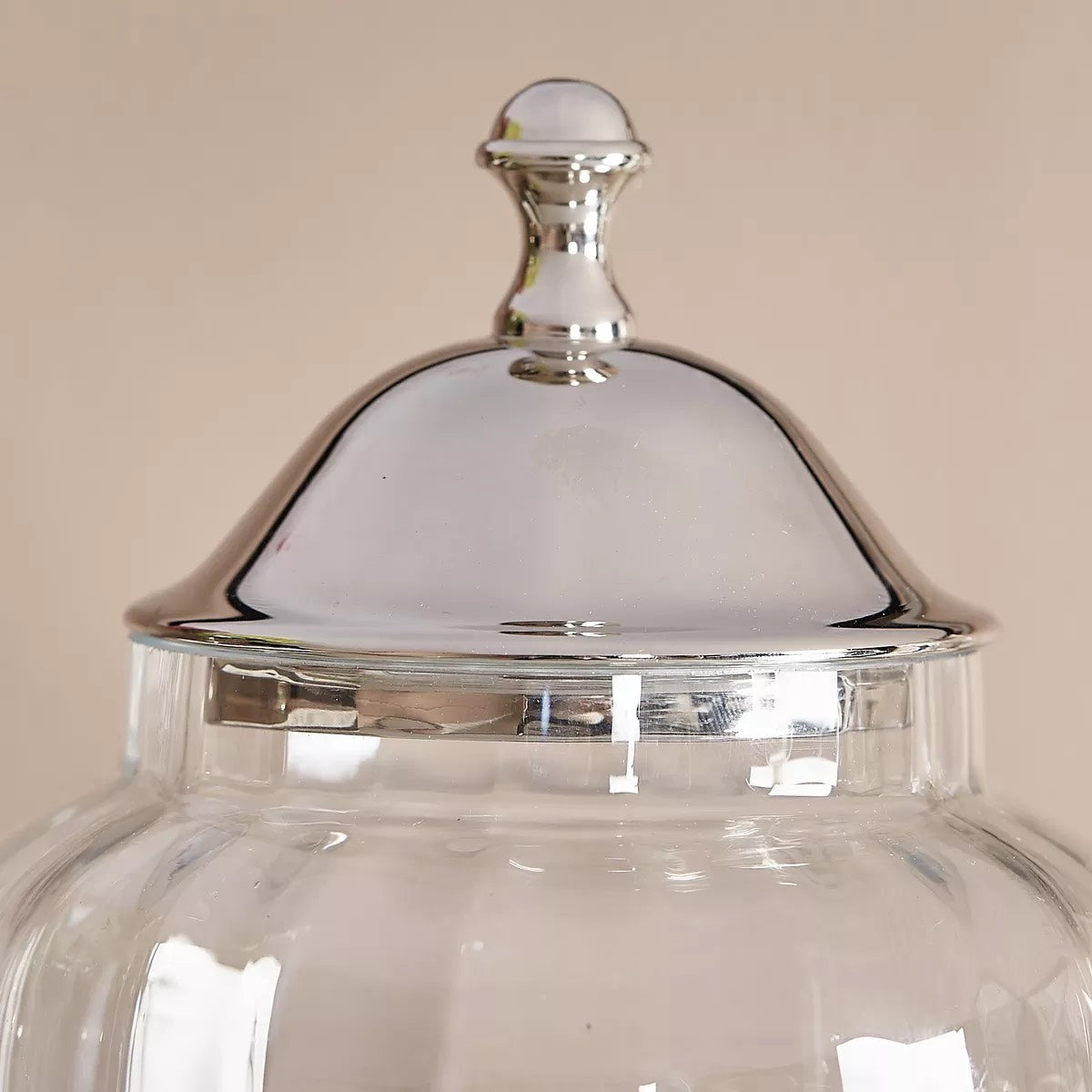Short and squat, this glass jar is a charming pick for your home. It features a polished lid and subtle facets. Use it to serve a variety of condiments - from cookies to dried fruits and more. Measures 16.5 height x 12.5 cm diameter.