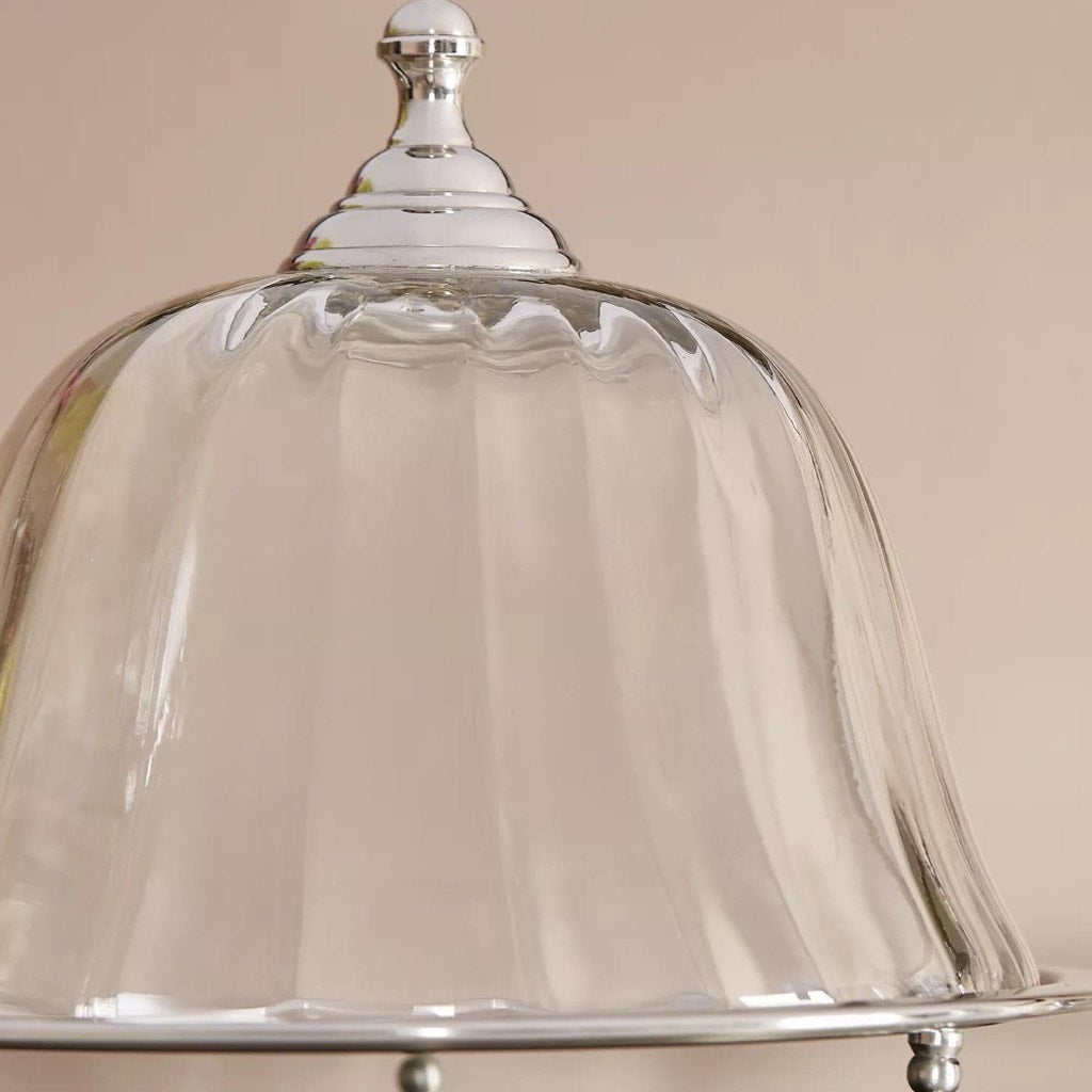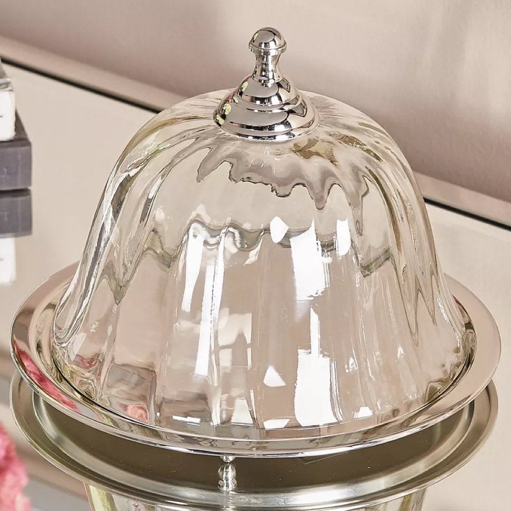 This decorative tray is perfect for displaying cakes and delicious goodies. It comes with a faceted glass dome. Polished metal details enhance the overall look of the tray. Measures 24 cm in diameter, 18.5 cm in height.