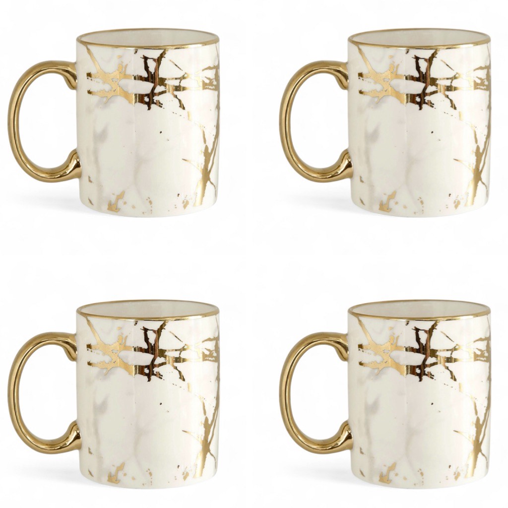 Set of four, 350 ml porcelain mugs. Hand wash preferable, to maintain the gold color.
