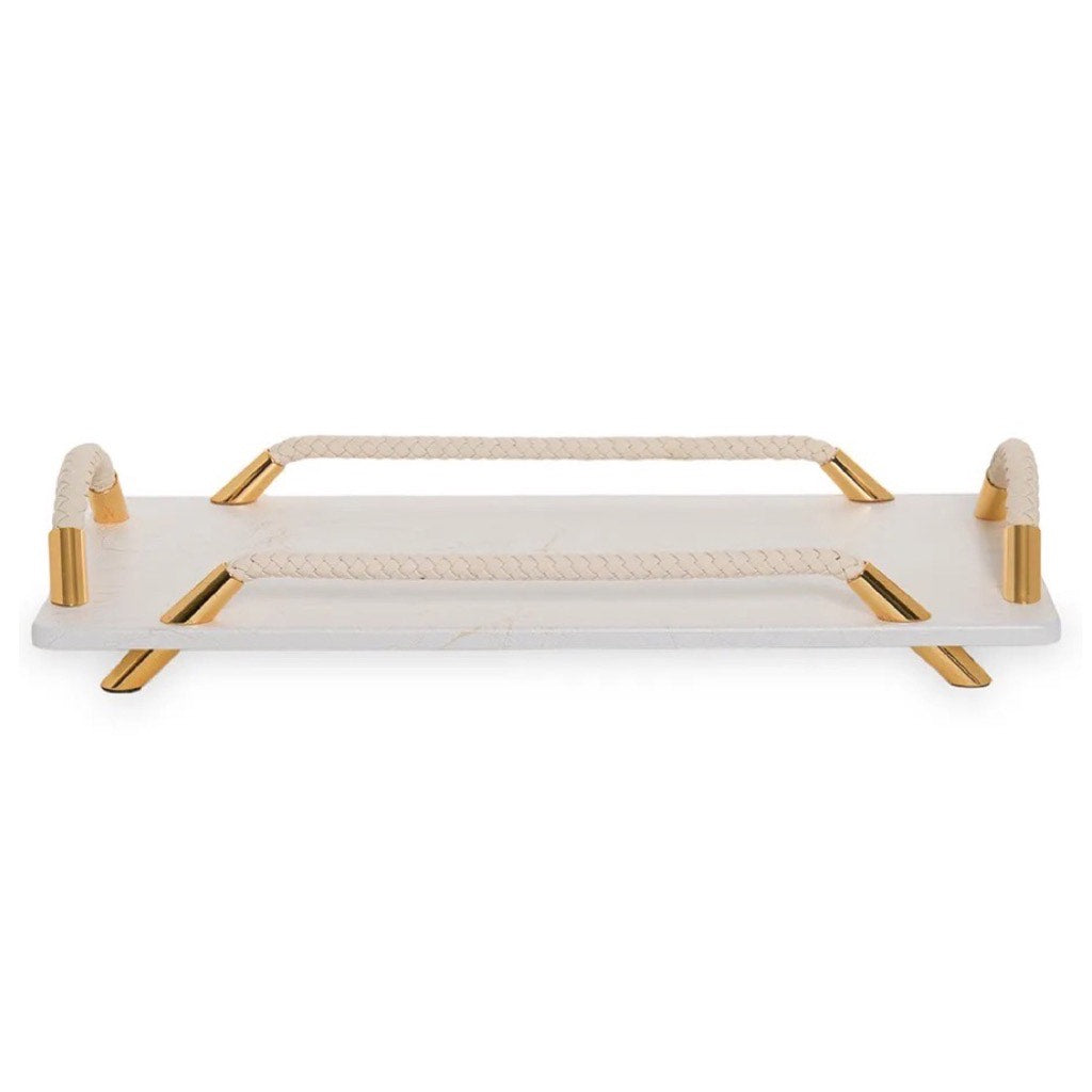 43 x 21 cm wooden tray with marble finish. Topped off with leather handles.