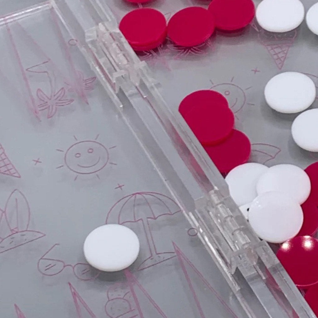 Infuse your game time with color courtesy of the Summer Vibes Tawla Acrylic Game Set. Crafted in clear acrylic and energized by bold Summer Vibes design details, this set turns every match into a celebration. The Summer Vibes Set comes complete with 30 checkers and a pair of dice. Combining artful design with gameplay practicality. Lightweight and brilliantly bold, it’s perfect for summer evenings, social gatherings, and stylish gifts alike.