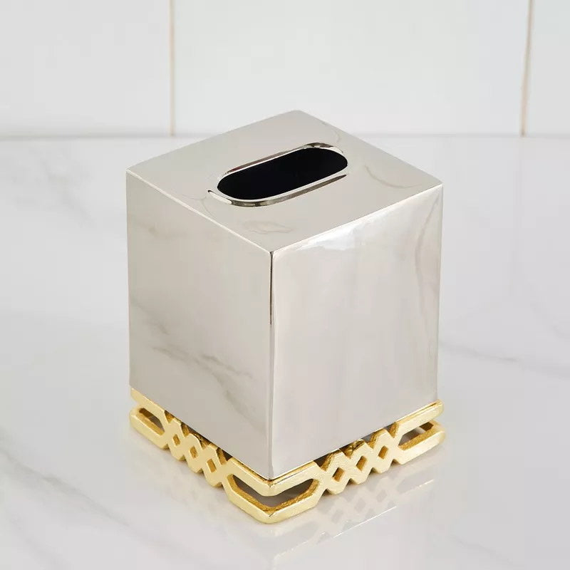 Stainless steel tissue box with gold tone metal motif.