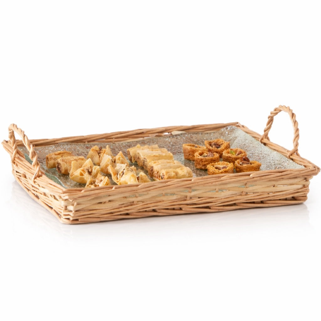 Glass serving dish embrasses a 39.5 x 27 cm bamboo tray.