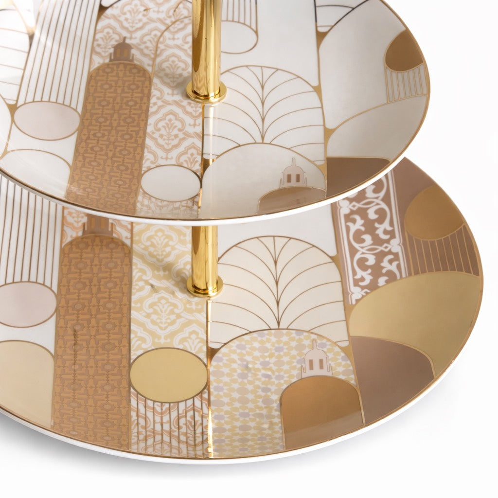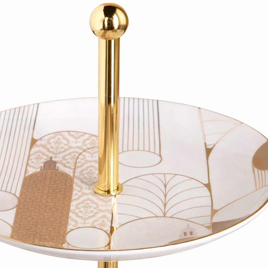 32 cm diameter porcelain two tier serving with metal pole. Perfect for serving desserts and dry appetizers.ย