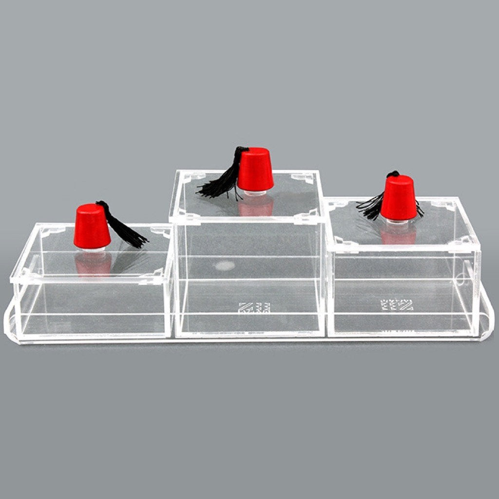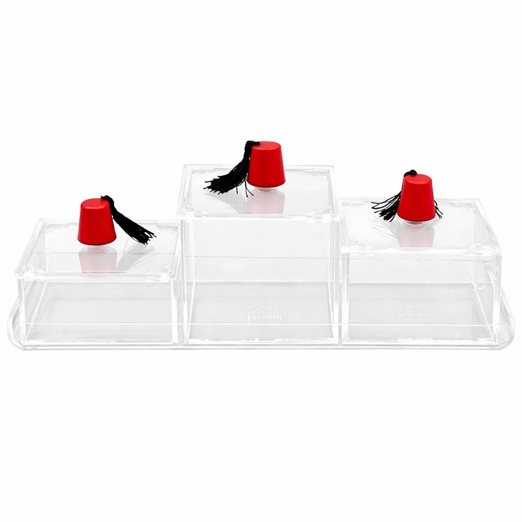 Serve traditional Ramadan dried fruits, dates, nuts, chocolates and more in this three box plexiglass serving concept. Topped off with a tarbouche handle. Measures 30 x 10 cm.